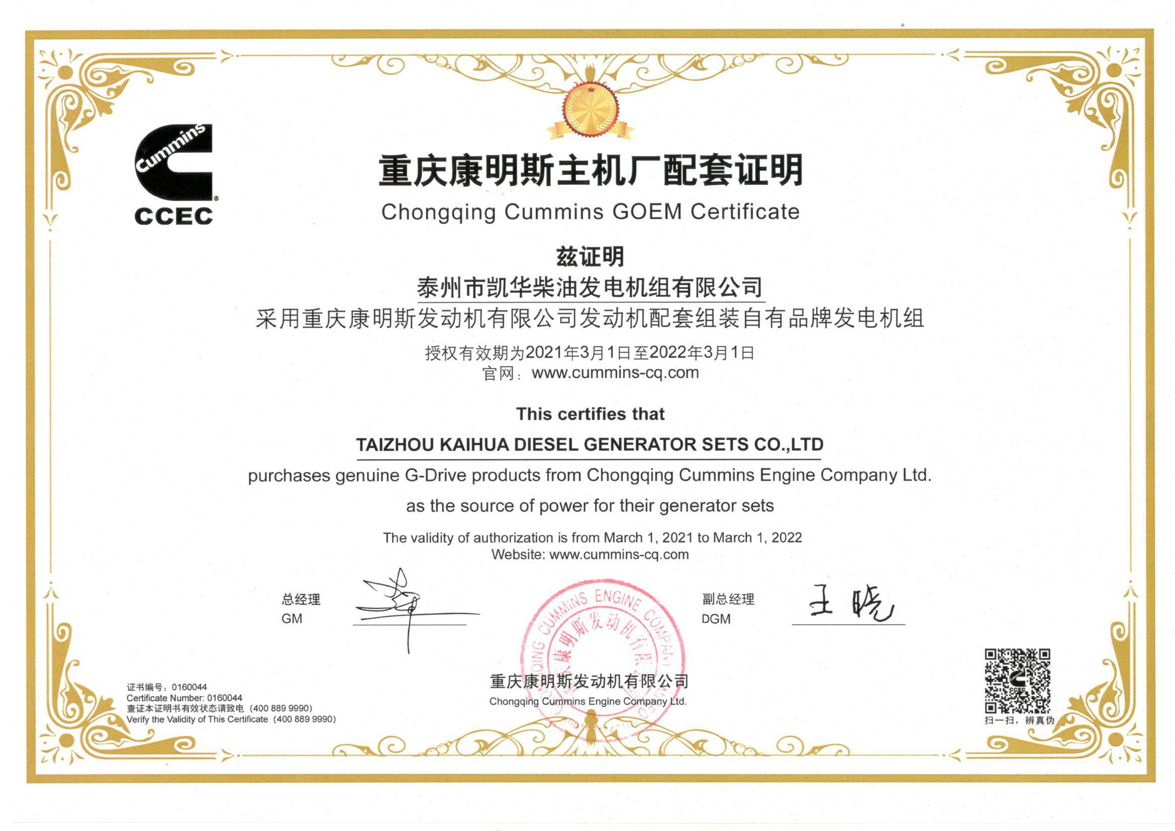 泰州市凱華柴油發(fā)電機(jī)組有限公司創(chuàng)建于2003年,是一家集柴油發(fā)電機(jī)組燃?xì)獍l(fā)電機(jī)組的研發(fā)、生產(chǎn)、銷售為一體的高新技術(shù)民營企業(yè),公司座落于“漢唐古郡,淮海名區(qū)”,具有“鳳凰城”美稱的祥泰之州——江蘇省泰州市,地處中國經(jīng)濟(jì)最發(fā)達(dá)的長三角經(jīng)濟(jì)圈,水陸空立體交通,地理位置十分優(yōu)越。公司目前注冊資本金11800萬元人民幣,生產(chǎn)基地占地六十畝,現(xiàn)有各類高素質(zhì)員工一百多名,專業(yè)技術(shù)人員達(dá)46人,其中高級技術(shù)人員16人,年銷售額近6億元。 公司主營產(chǎn)品:3~3000KW陸用柴油發(fā)電機(jī)組,15~600KW移動(dòng)拖車電站,12~1000KW船用應(yīng)急柴油發(fā)電機(jī)組,各種靜音型、中高壓、多機(jī)并聯(lián)、燃?xì)獾忍胤N機(jī)組以及進(jìn)口系列柴油發(fā)電機(jī)組,可滿足不同客戶的一切電力需求,還可滿足用戶不同電壓、不同頻率的要求。凱華公司是康明斯品牌的授權(quán)代理商,專業(yè)生產(chǎn)供應(yīng)康明斯柴油發(fā)電機(jī)組。